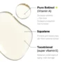 - Καθαρή Ρετινόλη (Βιταμίνη Α): Επιταχύνει την παραγωγή κολλαγόνου και τον κύκλο εργασιών του δέρματος για τη βελτίωση των λεπτών γραμμών.